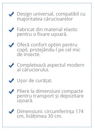 Plasa pentru carucioare este un accesoriu esential pentru siguranta și confortul bebelușului tau. Ofera protectie eficienta impotriva insectelor, astfel incat micutul sa se bucure liniștit de plimbari sau momente de joaca și somn in aer liber.
