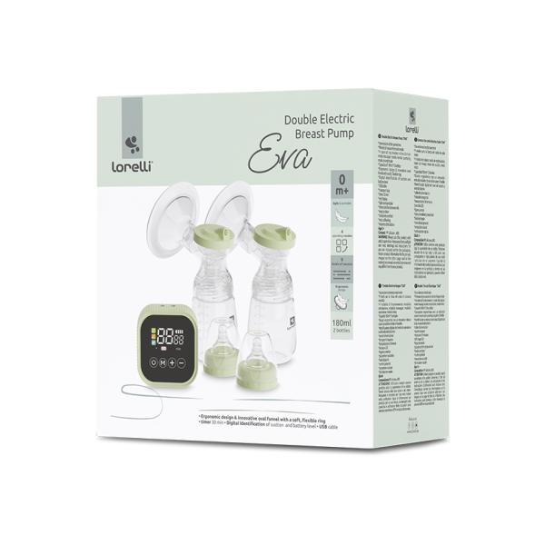Pompa de san electrica dubla EVA este usoara, portabila si este destinata pomparii si colectarii laptelui matern de catre femeile care alpteaza. Aceasta pompa ofera un ritm natural de impulsuri, care imita suptul bebelusului, pentru a provoca un flux rapid si constant de lapte. Stimuleaza lactatia si calmeaza durerea in cazul acumularii in san a unei cantitati mari de lapte. Cupa pentru san are o palnie moale si un design ergonomic, pentru a se potrivi cu toate marimile si formele de sani. Puteti extrage laptele in biberonul de 180 ml inclus in set si apoi sa alaptati bebelusul direct din biberon.