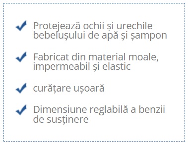 Are o inchidere reglabila cu capse, astfel incat sa poti ajusta cu usurinta dimensiunea pe capul copilului tau. Protejeaza ochii, fata si urechile copilului impotriva stropilor, reducand disconfortul si lacrimarea in timpul baii.