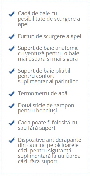 - set de baie compus din: cadita de 88 cm, reductor de cada detasabil , suport accesorii, 2 recipiente speciale pentru sapun si sampon, termometru detasabil, furtun pentru scurgere.
