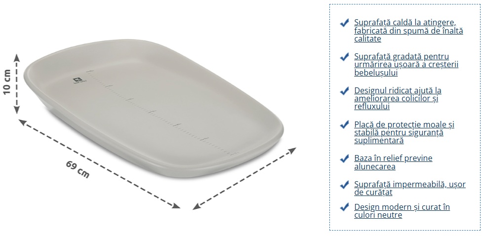 - partea inferioara este texturata tip „fagure”oferind un efect de vid. Greutatea copilului creeaza o prindere naturala pe masa de infasat, prevenind alunecarea si permitand mutarea usoara dupa utilizare.
