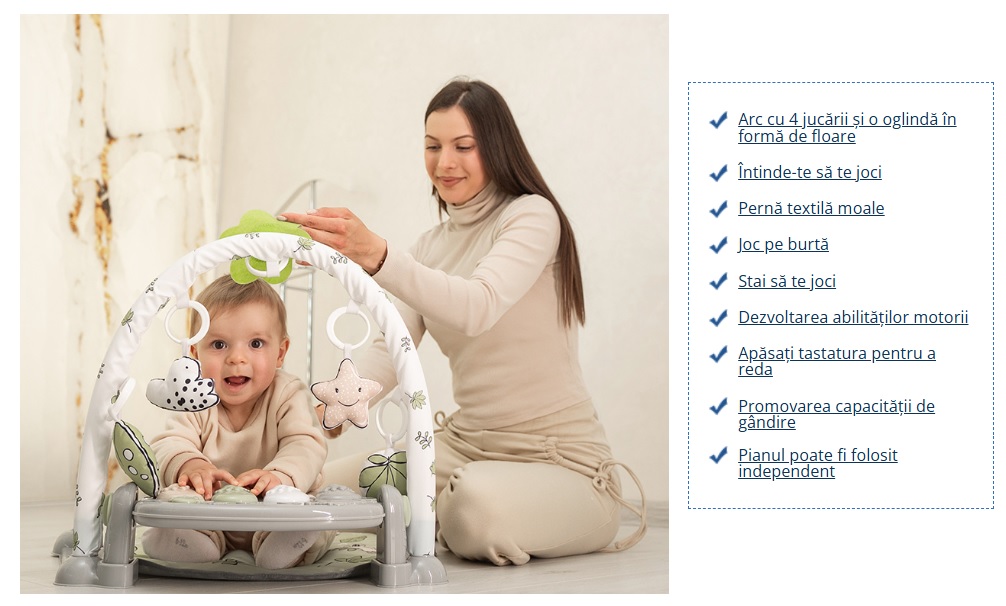 - dispune de o arcada cu jucarii, iar copilul poate sta intins sa descopere si sa exploreze.