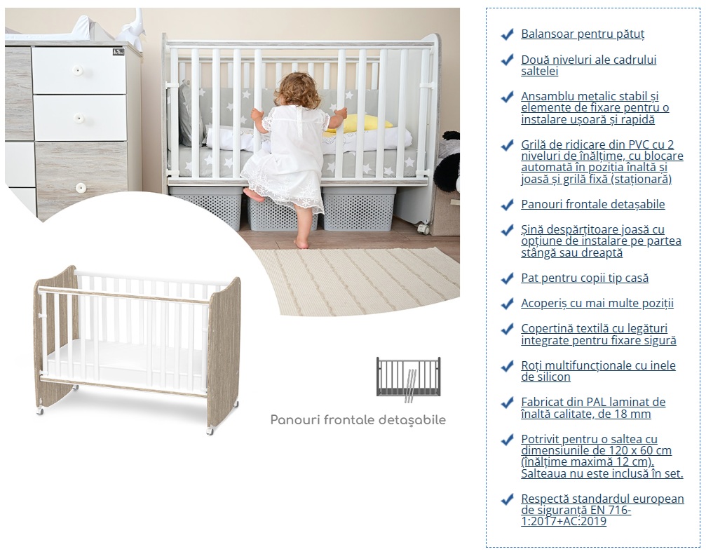 | Caracteristici speciale | grilaje culisante, somiera reglabila, acoperis detasabil, sistem de leganare, roti blocabile, usor de asamblat |