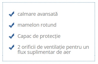 - tetina are o baza plata, astfel se reduce presiunea aplicata asupra maxilarelor si a dintilor. Siliconul moale calmeaza gingiile si este usor de acceptat de catre bebe, fiind potrivita pentru zi si noapte.