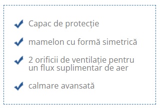 - tetina are o baza plata, astfel se reduce presiunea aplicata asupra maxilarelor si a dintilor. Siliconul moale calmeaza gingiile si este usor de acceptat de catre bebe, fiind potrivita pentru zi si noapte.
