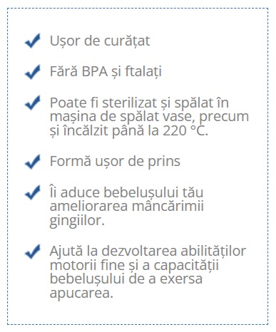 - material: silicon de înaltă calitate, non-toxic şi non-alergic, cu forme rotunjite. Se curăţă cu apă şi săpun delicat.
