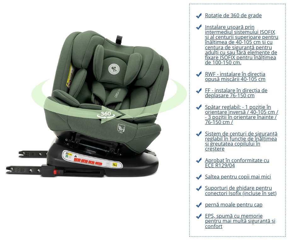- scaun auto dotat cu baza rotativa la 360⁰, avantaj ce permite asezarea copilului de la 0 la 13 kg cu spatele catre directia de mers si asezarea copilului de la 9 kg la 36 kg cu fata catre directia de mers, fara sa mai fie necesara ridicarea scaunului si repozitionarea lui pe bancheta.