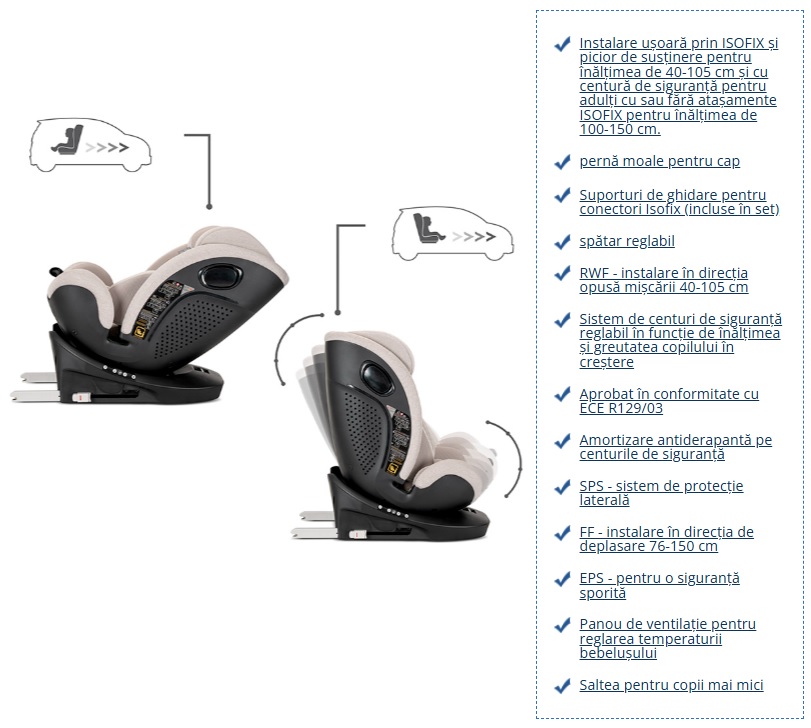 - baza scaunului auto se fixeaza doar cu ajutorul sistemului isofix.