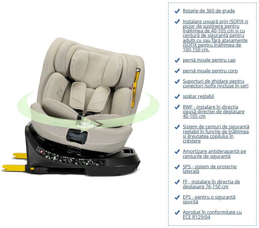 - scaun auto dotat cu baza rotativa la 360 grade, avantaj ce permite asezarea copilului cu spatele catre directia de mers sau cu fata catre directia de mers, fara sa mai fie necesara ridicarea scaunului si repozitionarea lui pe bancheta.